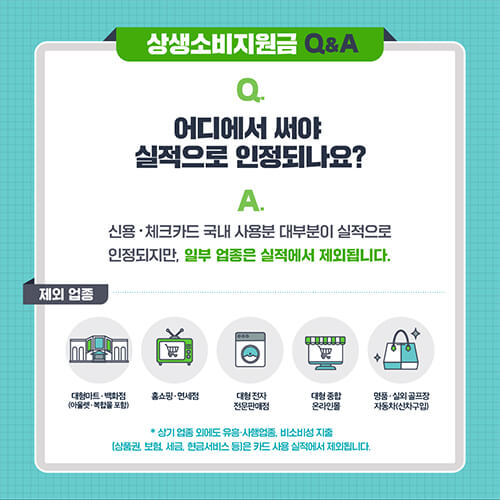 이밖에도 신규 자동차 구입, 명품 전문매장, 실외 골프장, 연회비 등 비소비성 지출 등은 사업 취지와 다소 어긋나 인정되지 않습니다.
