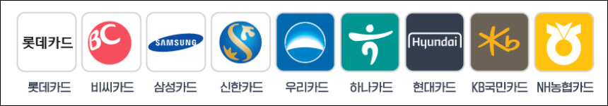 | BC카드 | IBK기업은행, DGB대구은행, SH수협은행 및 수협 영업점, 전북은행, 새마을금고 |