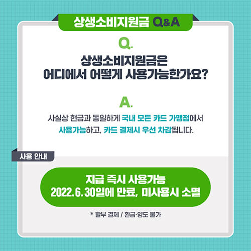 상생 소비지원금으로 받은 캐시백은 카드 결제 시 우선적으로 차감되며, 할부 결제는 할 수 없습니다. 사용기한은 2022년 6월 30일까지 입니다. 기간 내에 사용하지 않은 캐시백은 다시 환수된다고 합니다.