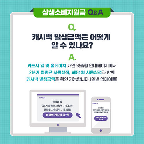 캐시백이 발생하게 되면 다음 달 15일에 전담카드사 카드로 자동 지급되며, 알림 톡 등을 통해 개인별로 통지됩니다.