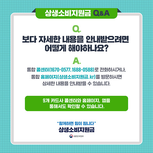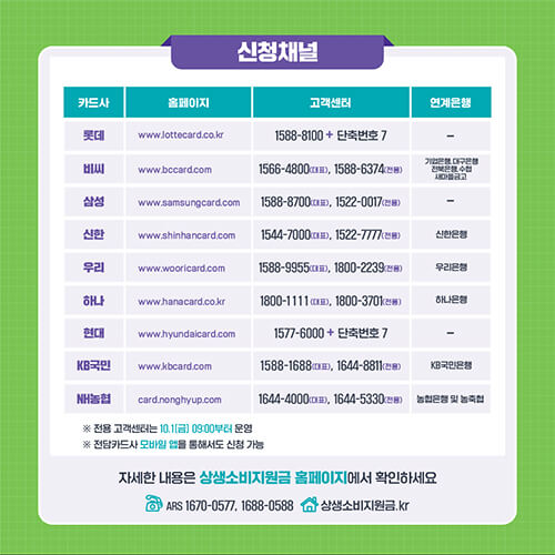 - 통합 콜센터 전화번호는 1688-0588, 1670-0577이며, 각 카드사별 상생 소비지원금 신청 전화번호는 다음과 같습니다.
