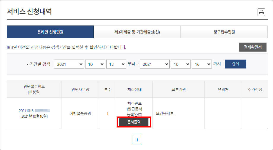 ⑦ 코로나 백신 접종 증명서 발급이 되었습니다. 서비스 신청내역 화면에서 문서출력을 선택합니다.