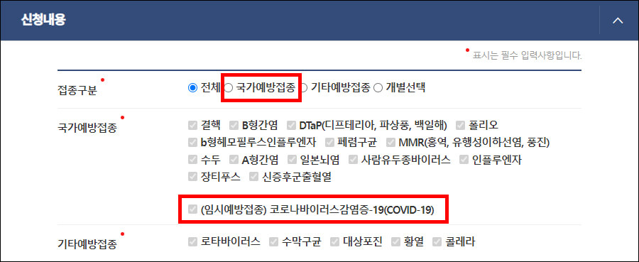 신청내용에서 접종구분을 국가예방접종으로 선택하고, 밑에 (임시예방접종) 코로나바이러스 감염증-19(Covid-19)를 선택합니다. 전체를 선택하면 그동안 받았던 예방접종 내역이 모두 출력됩니다.