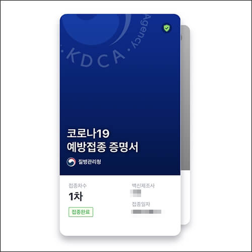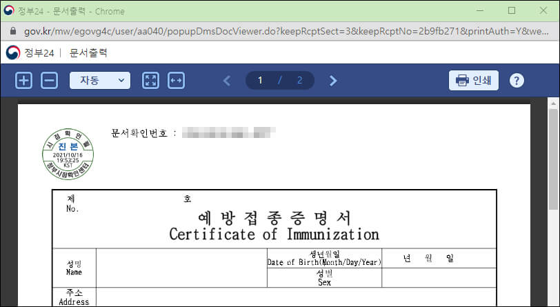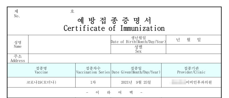 이제 코로나 백신 접종 증명서 출력 작업이 완료되었습니다. 아직 1차 접종밖에 받지 않아서 내용이 단출합니다.