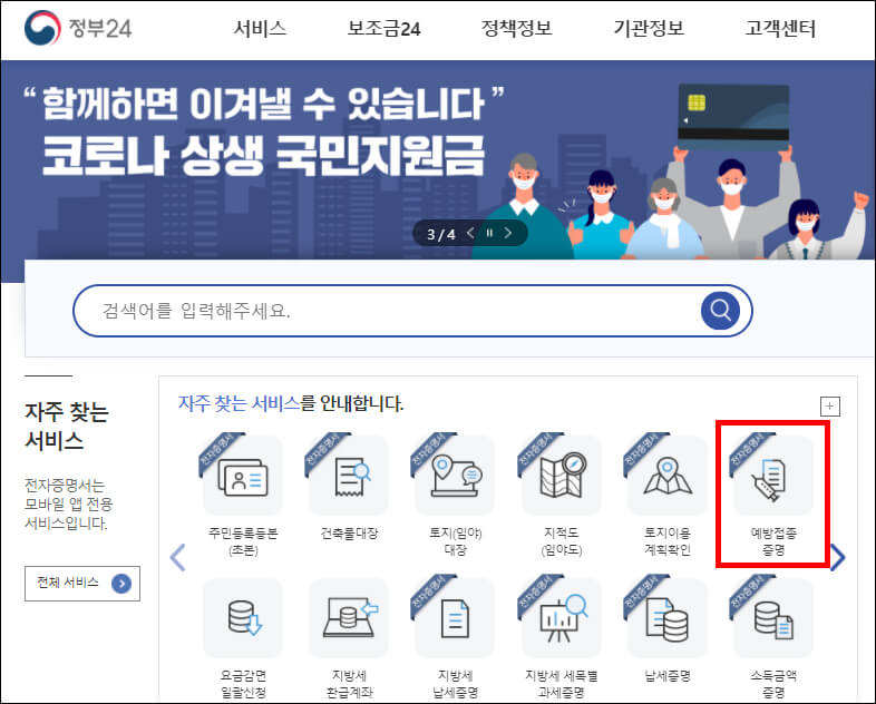 ① 정부24 홈페이지에 접속합니다. 자주 찾는 서비스 중 '예방접종증명'을 선택합니다.