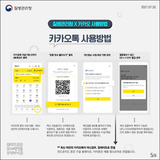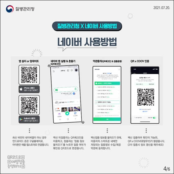 전자 출입기록 시 기존에 사용하던 카카오톡이나 네이버, 패스 앱 QR체크인에도 코로나 백신 접종 완료 정보를 연동할 수 있습니다. 백신 접종 여부 업데이트를 할 때에도 본인인증 절차를 거쳐야 합니다.