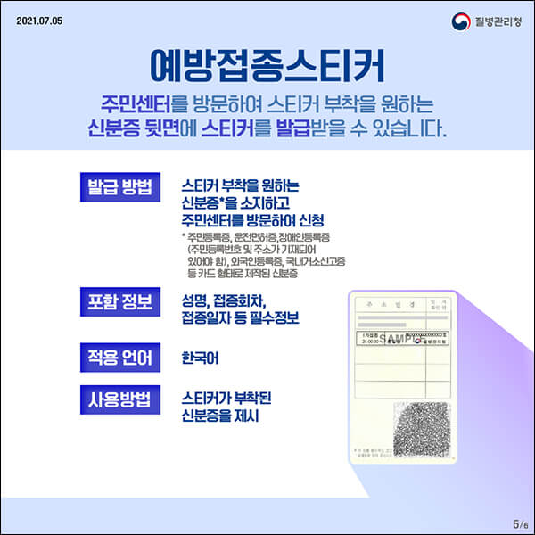 코로나 백신 접종 완료 증명을 위한 마지막 방법은 백신 접종 완료 스티커입니다. 스티커는 주민센터에서만 발급이 가능합니다. 전자증명서, 종이증명서 사용이 어려운 분들을 위해 제공되는 스티커는 주민등록증이나 운전면허증 뒷면에 부착하게 되므로 꼭 스티커 부착을 원하는 신분증을 지참하고 가셔야 합니다. 스티커에서는 접종 회차, 접종일, 이름 등 필수 정보만 확인할 수 있습니다.