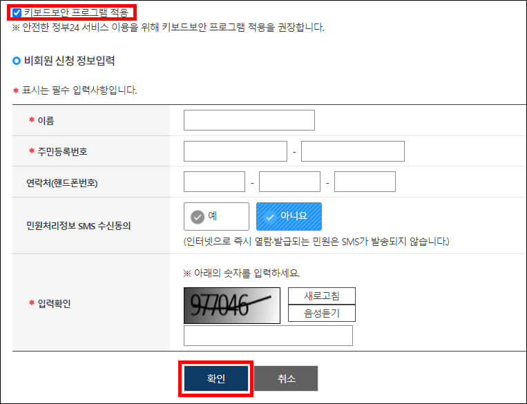④ 위의 약관들에 동의하고 밑으로 내려오면 정보입력란이 뜹니다. '키보드 보안 프로그램 적용'을 선택하고 이름과 주민등록번호, 입력 확인의 숫자를 따라서 작성하면 됩니다. 핸드폰 번호는 적지 않아도 괜찮습니다.