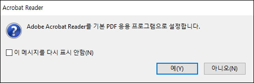 프로그램을 실행합니다. 만일 컴퓨터에 다른 PDF 뷰어가 이미 설치되어 있다면 Adobe reader를 기본 프로그램으로 설정하라는 팝업창이 뜹니다.
