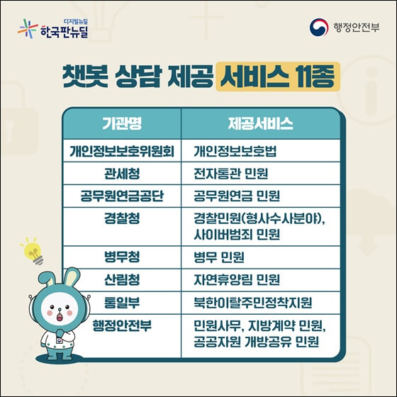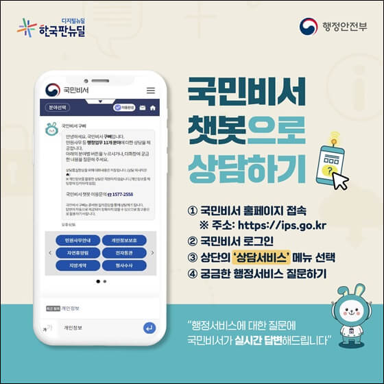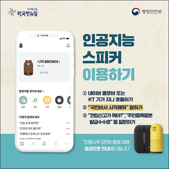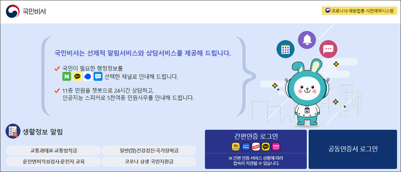굿(Good) 비서라는 뜻이 담긴 토끼 캐릭터를 통해 친근함을 내세우고 있는 국민비서의 인공지능(AI), 빅데이터, 클라우드 등을 활용한 신개념 서비스는 앞으로 우리의 삶을 더 편리하게 만들어 주지 않을까 싶습니다. 간단한 민원사무는 음성 안내도 지원된다고 합니다.