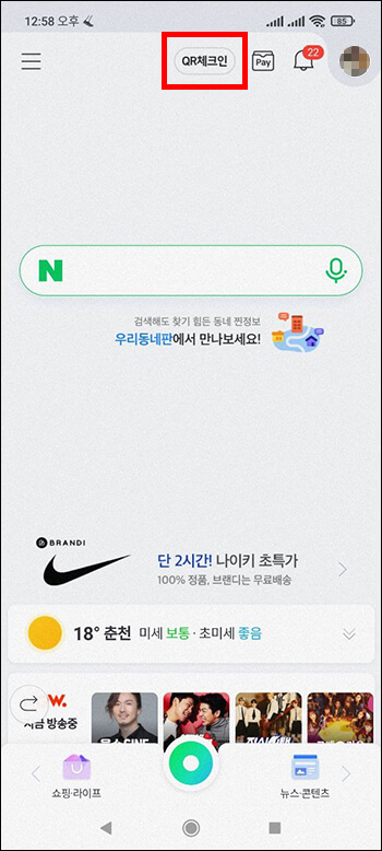 ① 네이버 앱 상단에 있는 'QR체크인' 메뉴를 선택합니다.
