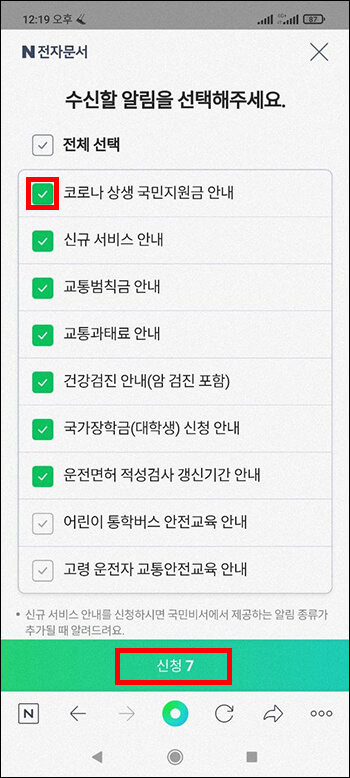 ⑩ 수신받고 싶은 알림을 선택합니다. 처음 화면에는 전체 선택되어 있습니다.