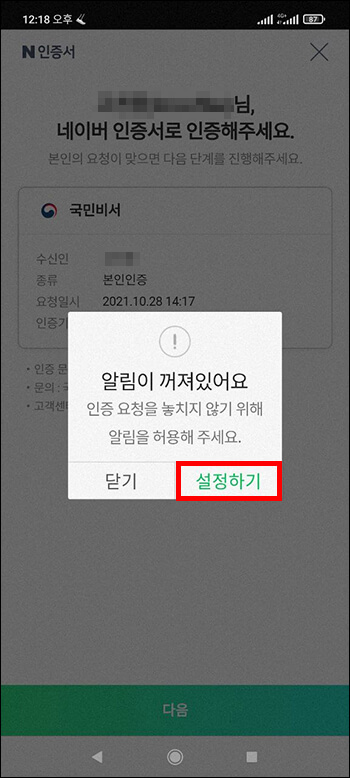 ⑦ 알림 설정이 꺼져 있으면 인증 요청을 놓칠 수 있으므로 설정을 변경해 줍니다.
