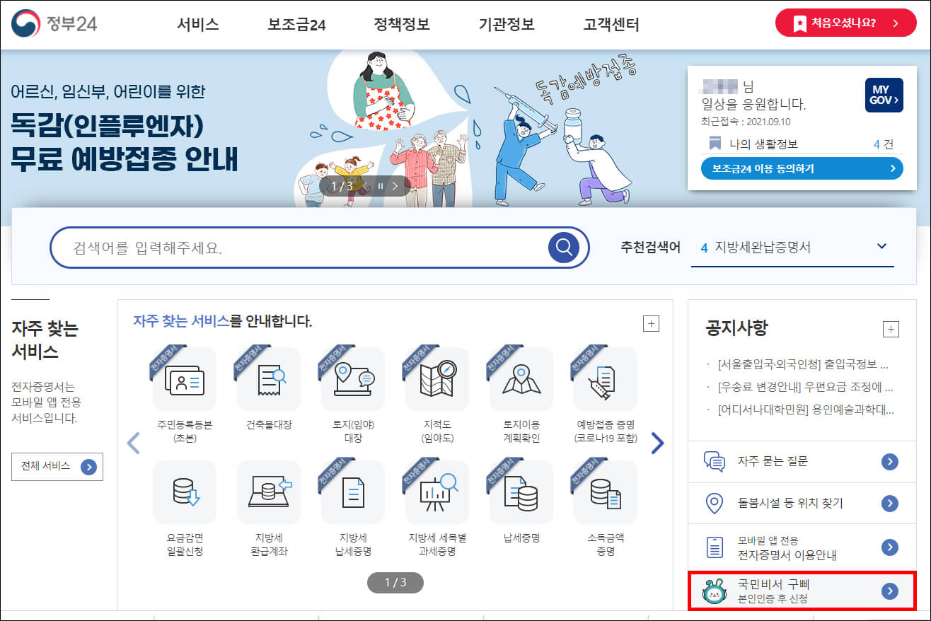 ① 정부24에서 로그인을 하고 공지사항 아랫부분에 있는 국민비서 구삐 신청을 누르고 순서대로 진행하면 됩니다.
