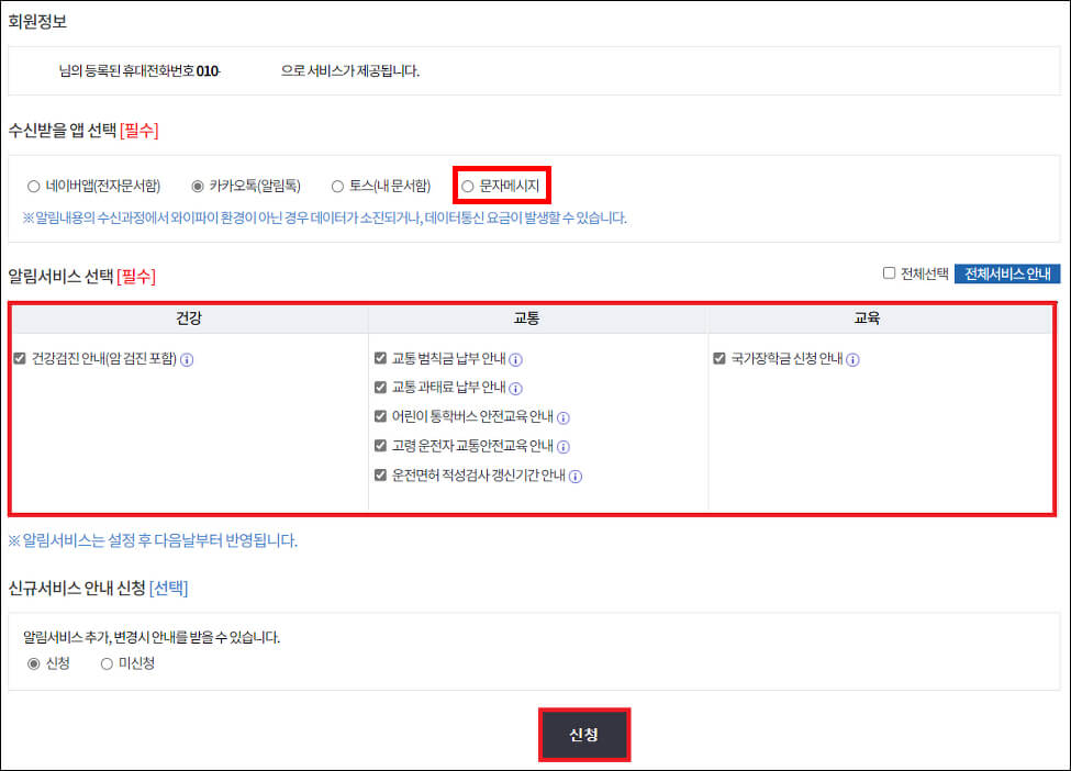 ③ 네이버 앱에서 진행했던 것처럼 약관에 동의하고 난 후 알림을 받을 플랫폼을 선택하고 알림 받고자 하는 서비스를 선택합니다. 이때 2G폰을 쓰는 분은 알림 받을 플랫폼을 '문자메시지'로 고르면 됩니다.