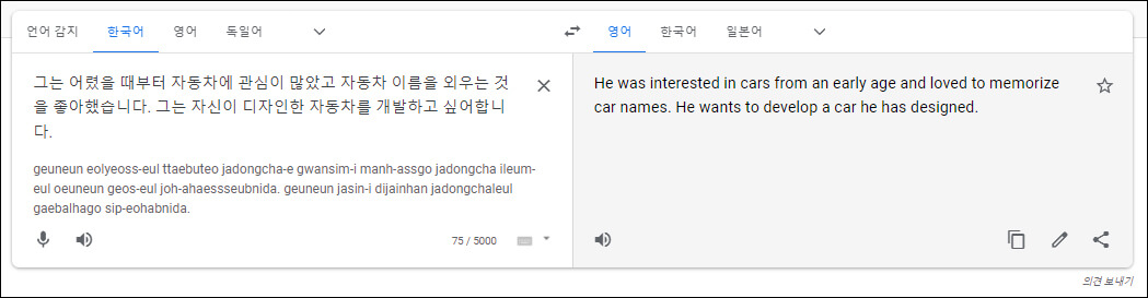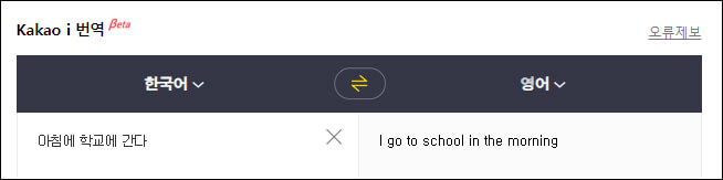우리나라에서 만든 파파고와 카카오 i는 자동적으로 주어를 집어넣어서 번역하지만, 구글 같은 경우는 주어가 없어서 완전한 문장 구조가 만들어지지 않습니다. 한글을 영어로 번역할 때는 '그는 아침에 학교에 간다'처럼 꼭 주어를 입력하시기 바랍니다.