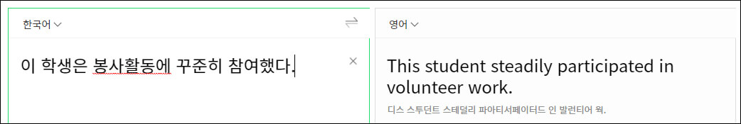 생활기록부에는 평상시에 쓰지 않는 학교 관련 내용들이 많기 때문에 부분적으로 헷갈리는 것들을 영어 번역기로 번역해 보았습니다. 그 과정에서 각 영어 번역기들의 특징을 어느 정도 이해할 수 있었고, 자연스러운 번역을 위해 어떻게 이용하면 좋은지 나름대로의 팁이 생긴 것 같습니다.